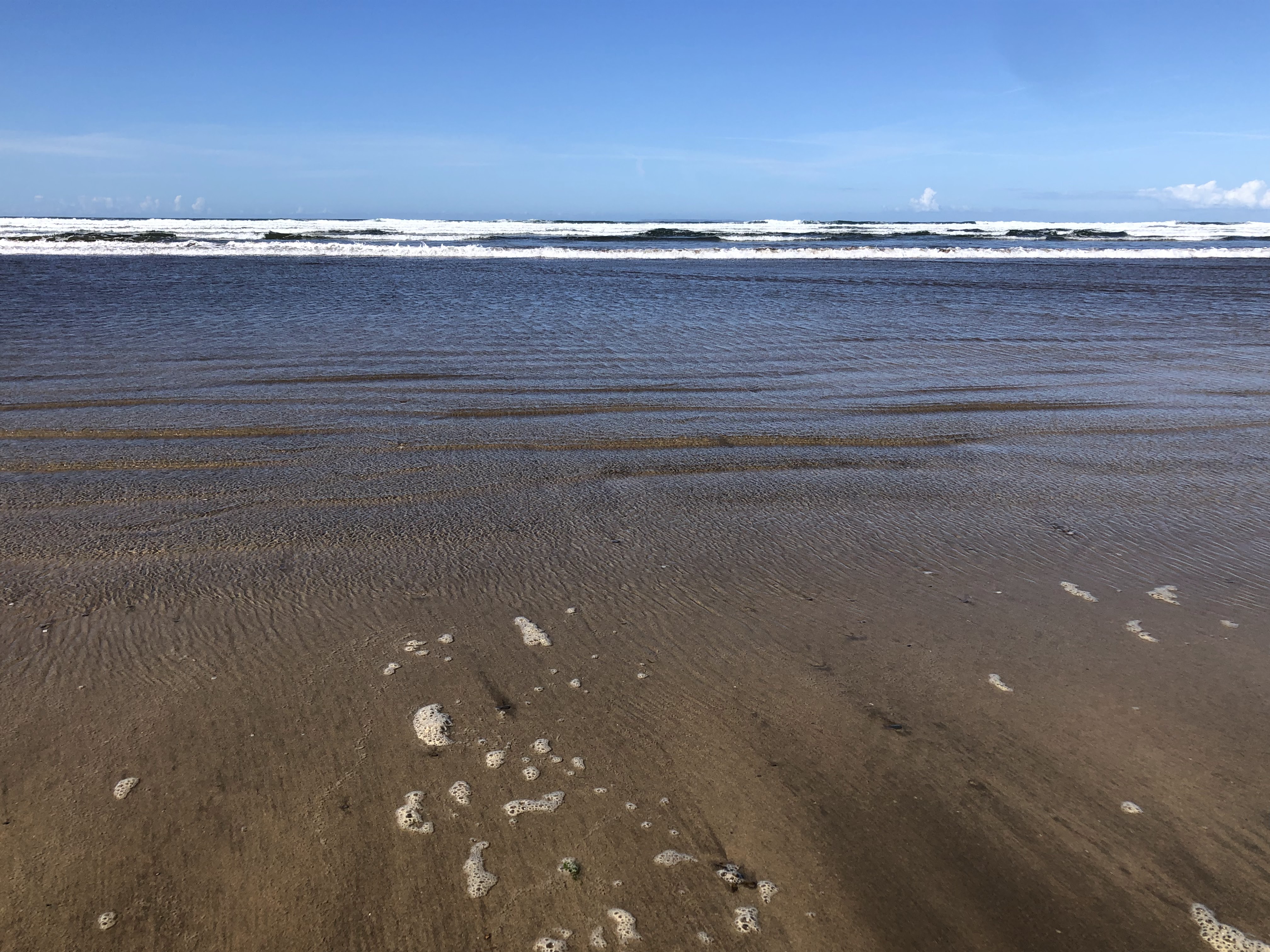 The waves are more of a gentle hiss and whisper today as they gently reach up the beach: The wind is louder. Imagine standing looking out to the horizon, breathing deeply, and standing still as the waves reach all the way up to your toes: Let go and be.