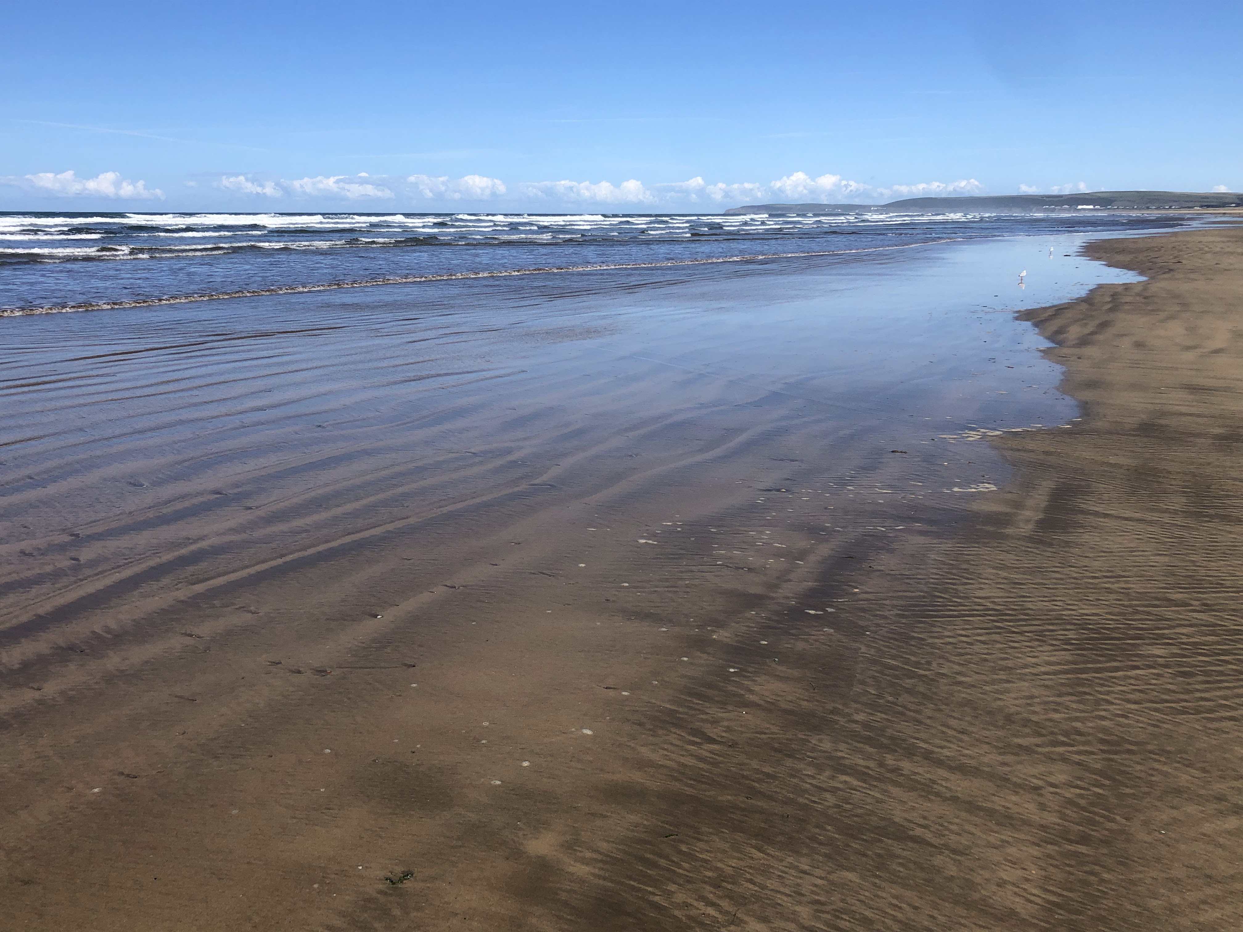 Imagine the scrunch of sand under your feet, feel the mild but rather strong wind tug your hair and obscure the sound of waves with its own constant thrum. Look out to sea, beyond the ripples of reaching tide, across the rim of whispering surf to the pale egg blue sky. Raise your eyes from the horizon, up towards the deeper blue that sweeps back overhead to envelope you into the sea-sky hug. Feel tiny, but part of a whole. Feel small but an integral part of a big picture.