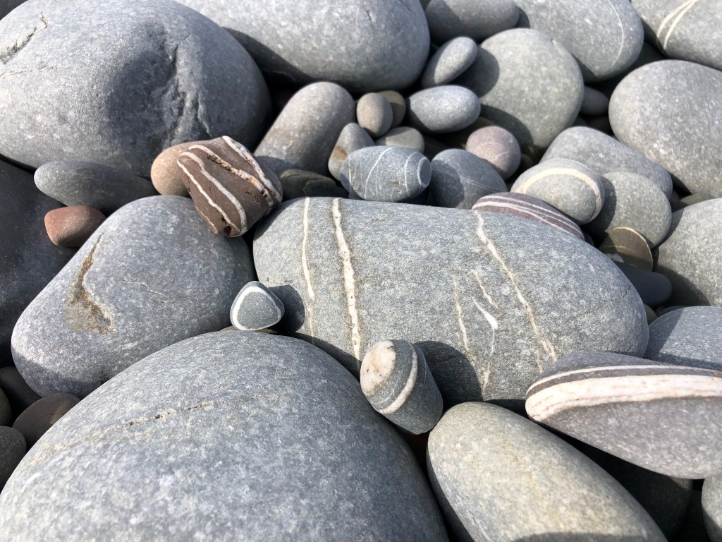 Looking closely at the pebbles along the ridge this morning made me hungry. They reminded me of sweets. Many of them seemed to have a layer of mint or cream through them, reminding me of Humbugs, or the black and white Liquorice Allsorts, or the sweets that are actually called ‘pebbles’….!