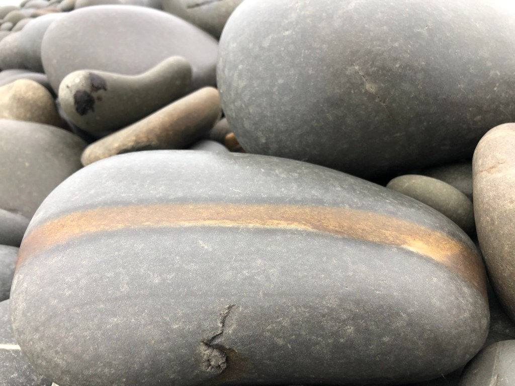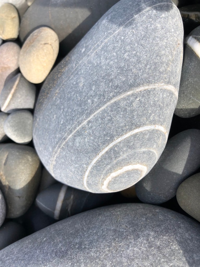 Imagine sitting on this pebble ridge for a while today, to look out to sea. Feel their bump and bruise on the bottom and back as they nudge us with so much age and ‘time’ etched into their shape and pattern. What does that feel like for you?