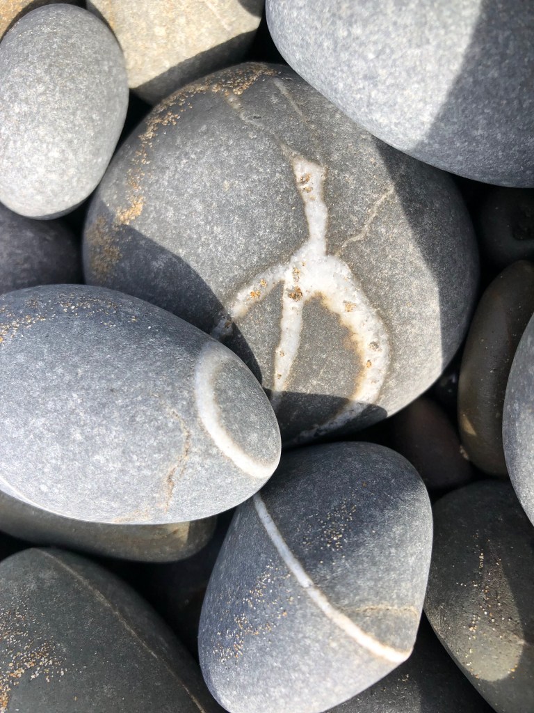 I invite you today to take a few moments to relax against the knobbly pillows and be a pebble too: You have nowhere to go, nowhere to be, you are a rock. Time has no significance and rolls out and over you in every direction. You rest where the sea throws you, you roll under people’s feet, you feel the light touch of a gull’s toe, you get wet, dry off in the sun. You soak in the warmth of the sun and then feel it radiate through you back out into the cooling day, setting up a small shiver in the air as the warmed layer rises upwards and cooler wafts from the sea to cool you again. You have no fear, no will to be anywhere else, no worry about what will happen next – you just are – a smooth round cobble in the moment of today.