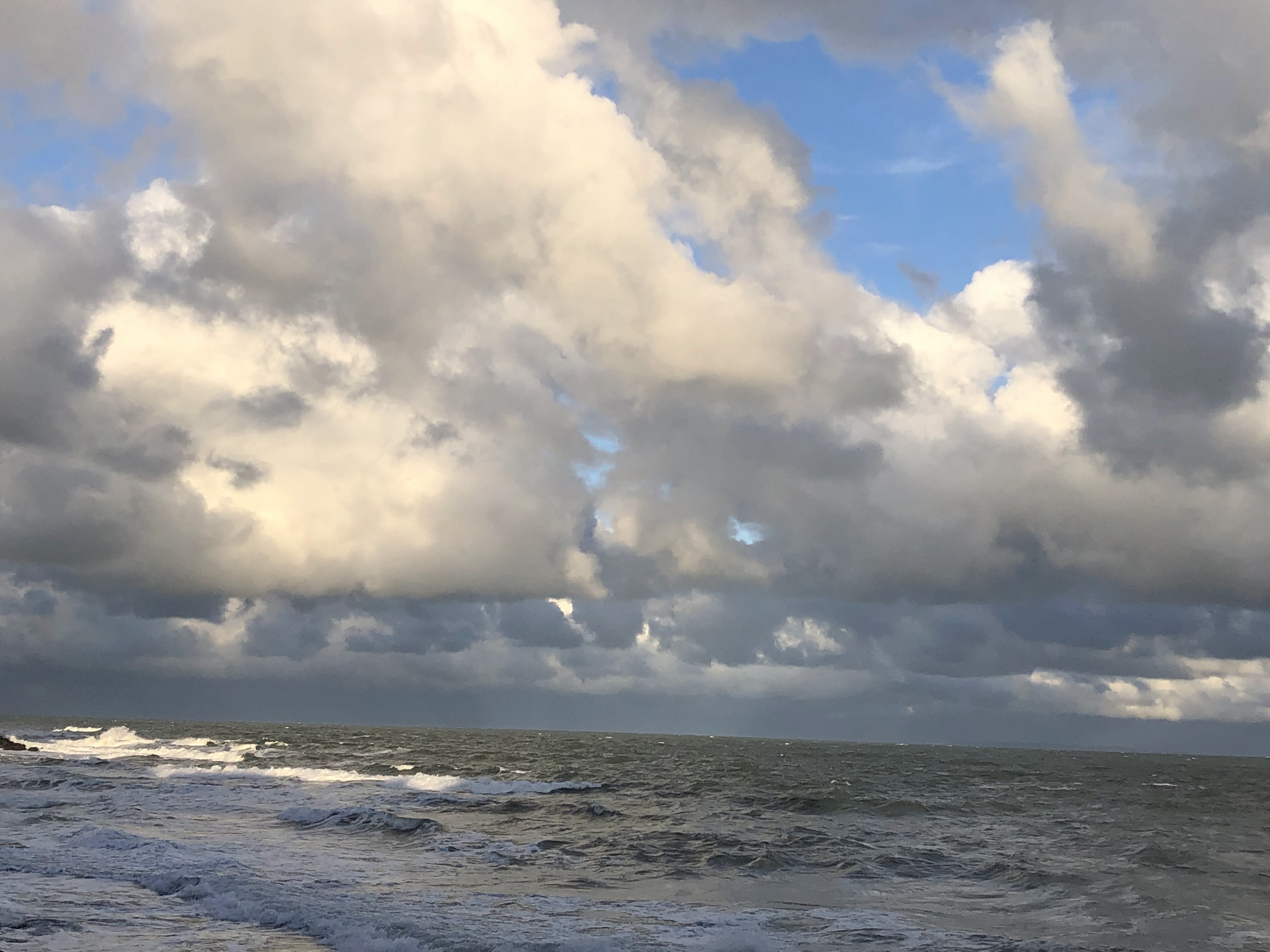 And it is not just about the waves, look up. The clouds wherever you are present an endless screening of drama and beauty. Here we have a stage full of boisterous cumulus, towering clouds, hovering low and reaching high up and up like over-baked soufflés. Today there are a whole army of them, you can see row upon row, scudding menacingly across the sea. Seething energy above and below, mirrored.