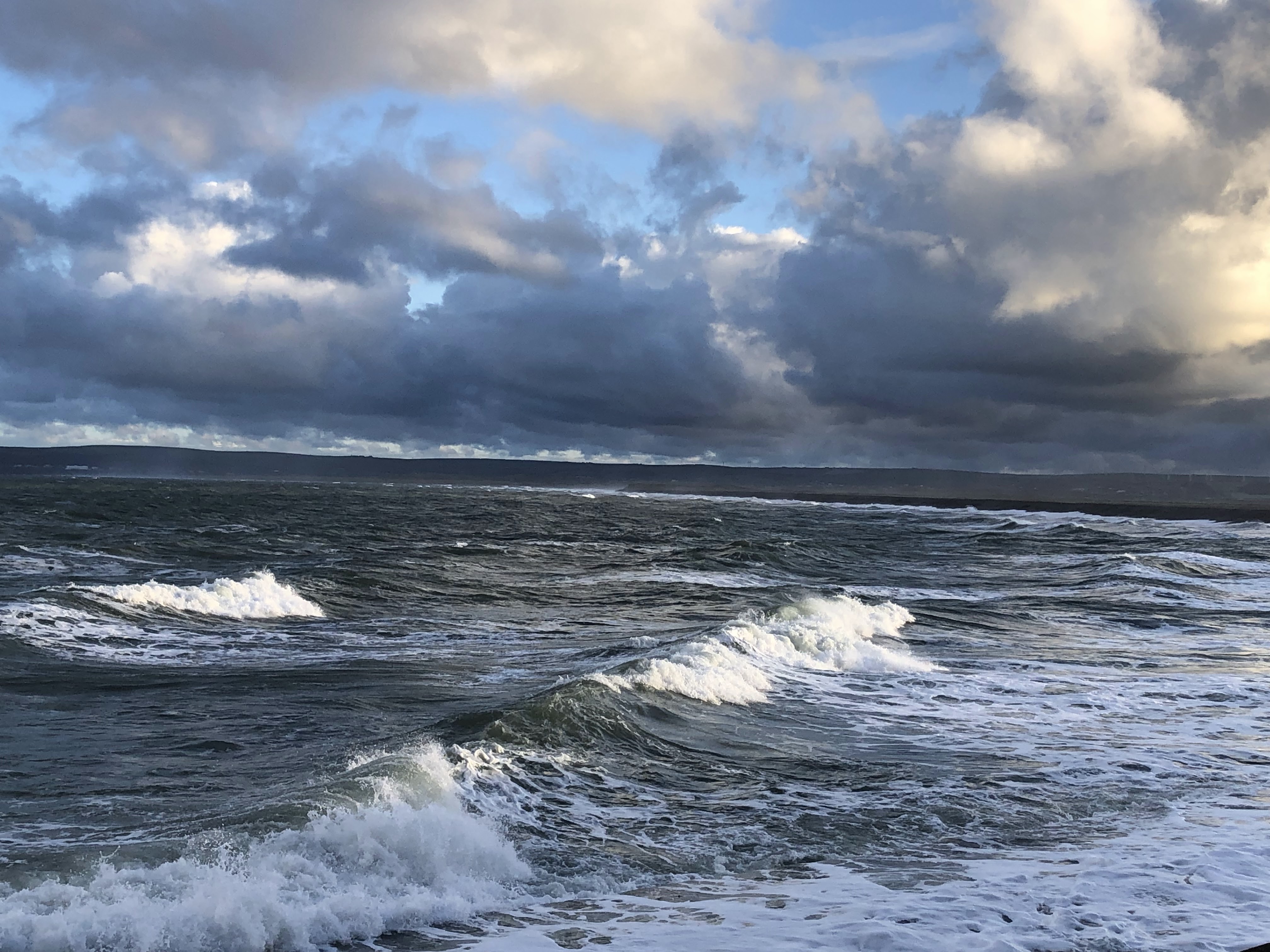 Look at the way the sun is breaking through the clouds and highlighting some waves as they spill in towards the shore. The sun makes the white of their ‘fuss and bother frills’ glow and shine! Further out white flecks contrast against the deep grey, almost glass-black of the sea, the excited energy of the water hardly being contained and fizzing to the surface.
