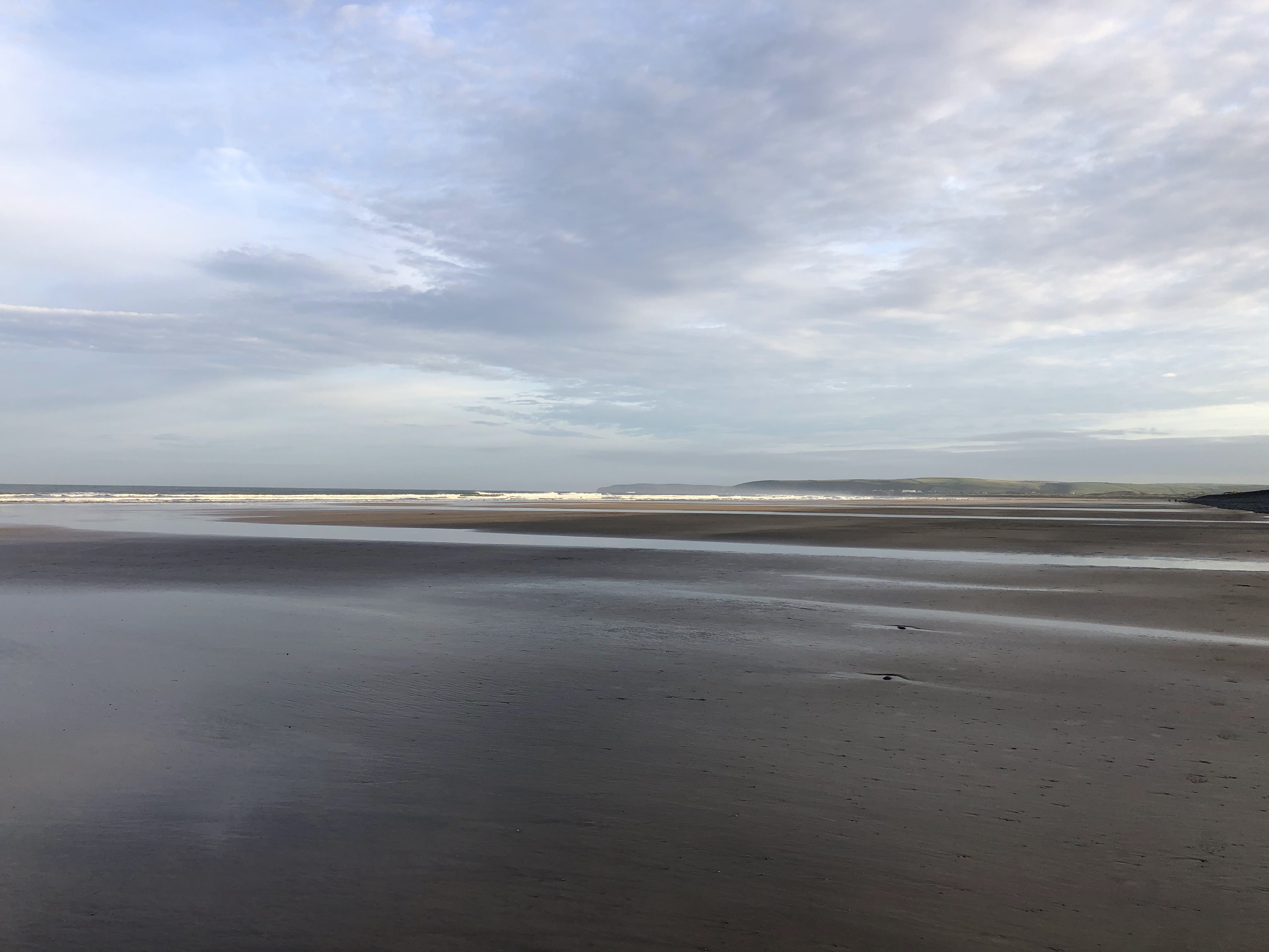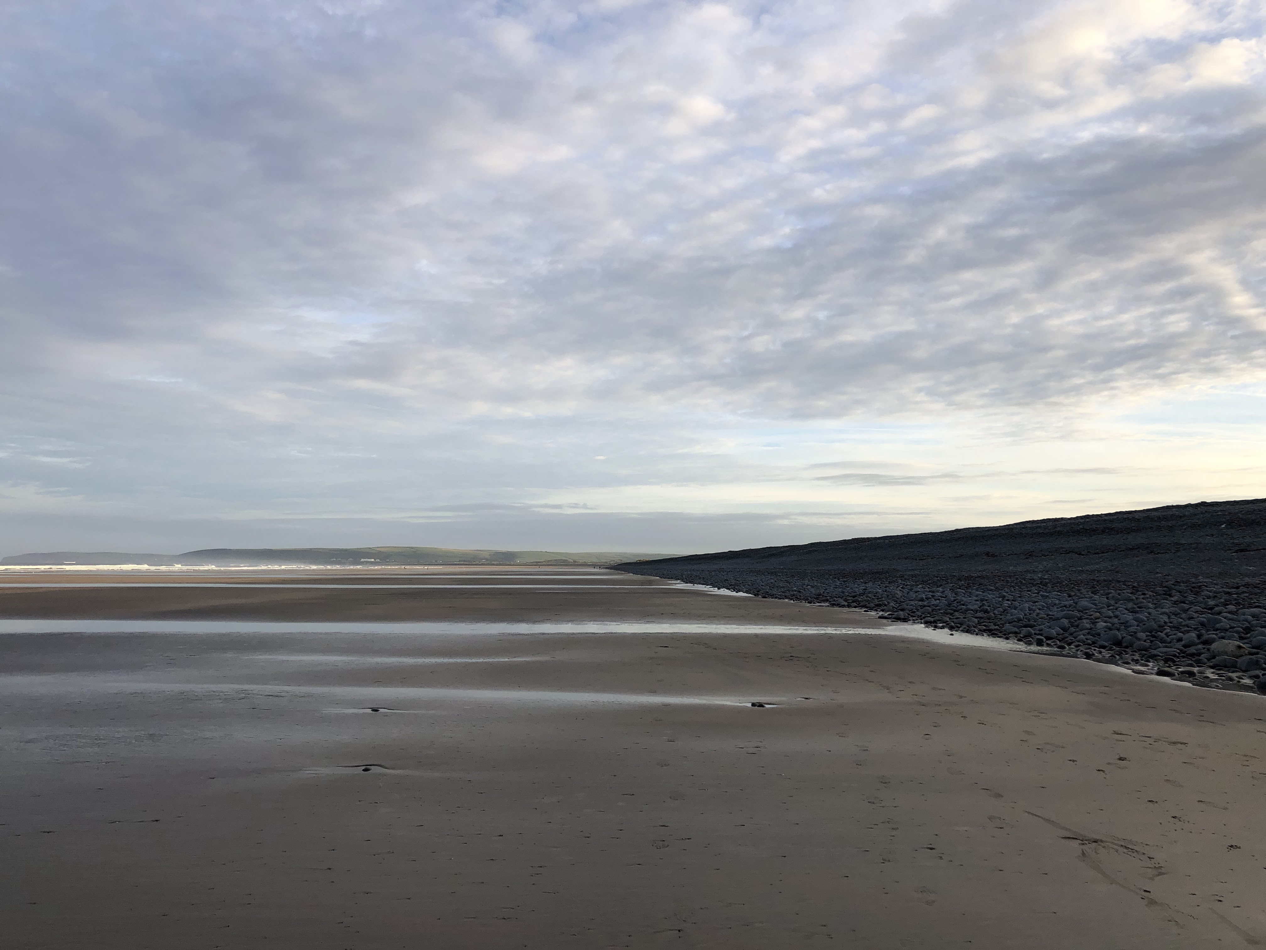 I invite you step onto this empty beach. There is only you. Leave everyone and everything else behind in the room, and just step through the frame onto the wet sand. And breathe. Feel the air fill up your chest as your heart lifts up towards the sky, feel the warm breath woosh out of your nose, emptying your lungs, expelling with it all your stresses and worries. The sea air today is not cold, but there is a soft South wind blowing over the pebble ridge out to sea. There is, however, a slight nip that comes with October, and you stride across the sand to keep out the chill. Try and keep your mind full of what you see – sky ribbed with cirrus clouds and the sand beneath your toes dark and wet.