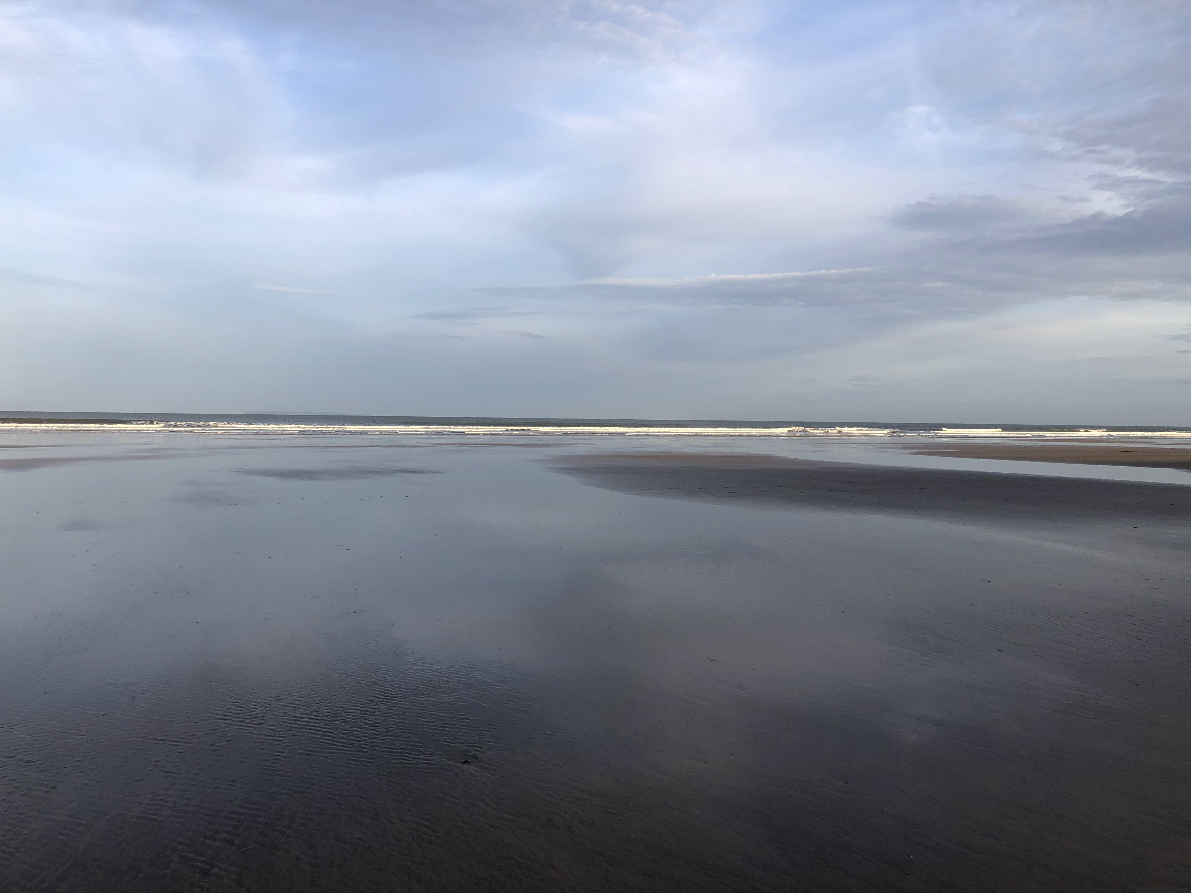 Turn towards the sea, far out along the horizon; a frilly edge of gentle surf. See the sky reflected in the wet sand, you are ‘sandwhiched’ between earth and sky, hugged by elements that know no judgement, criticism, hate nor exclusion – all are equally hugged, all are caressed by the wind and splashed by the puddles on the ground. You are not separate nor alone, but part of what you see, where you are in the present moment. Rest in this for a moment.