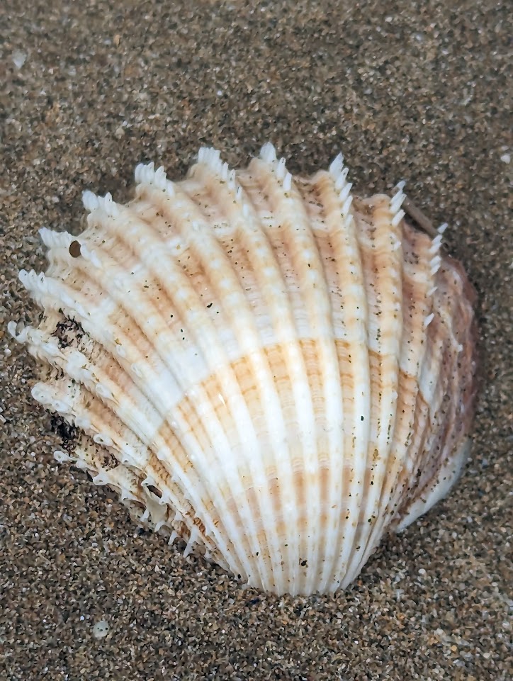This particular shell, with its delicate coloured bands, and tiny sharp white spines is a ‘rough cockle’. There would originally have been two shells (valves) joined together by a sinew connective tissue to allow it to open and close. It would have lived in the sand, sending out a tongue-like tube above the sand to breathe and filter the water for phytoplankton to feed.
