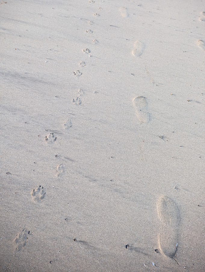 I thought it was interesting that the sand images above show that both the dog and human walk by placing their feet one in front of the other to create a line as if walking along a tightrope.