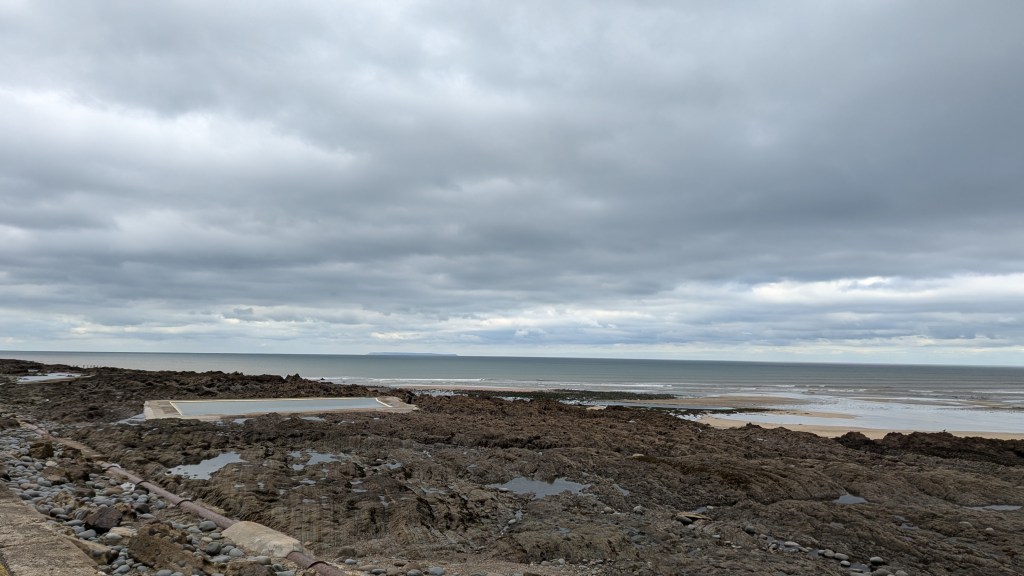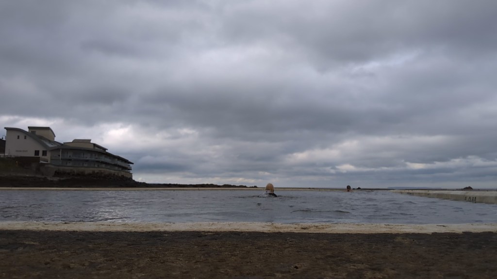 It is Day Two of the Dip a Day Challenge. The challenge is to raise awareness for the work of Surfers Against Sewage (SOS) in our seas and coastal waters. I headed down to the beach. But the tide was so far out across the sands that I decided to have a swim in the rock pool instead: A concrete lined pool carved within the natural rocks which empties and refills each day from the tide.